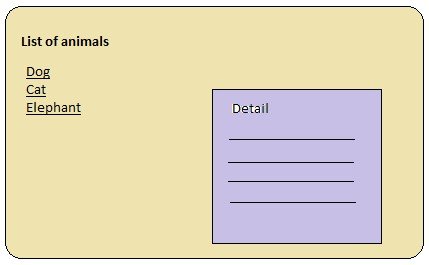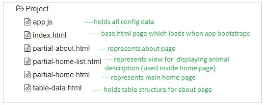 We have two views: partial-home.html(main) and partial-home-list.html(child). The main view displays the list of animals. As the user clicks on any animal, the child view is shown which displays the animal description.