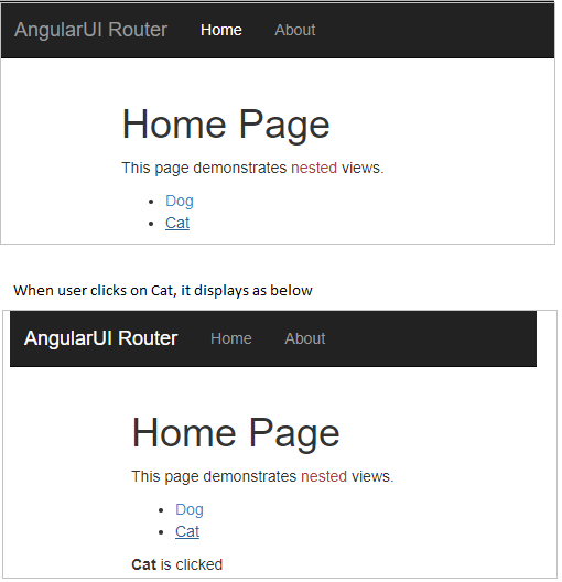 In this page, we have two simple links called Home and About. We use ui-View as ng-view in ng-Route to load a particular view as the user clicks on any link.