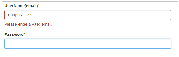 5) Email validation. As the user starts entering a value in the Username field, if it does not meet a valid email type, it displays the below-shown error. A valid email should have an ‘@’ character followed by other characters.