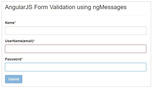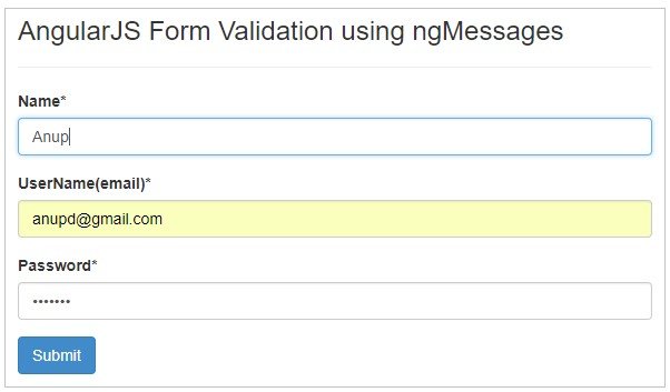 As explained in the last article, Form Validation in AngularJS, we will use the same login page with three fields: Name, Username (should be an email of the user), and Password. We shall perform the same validations using ngMessages. So validation requirements are like,