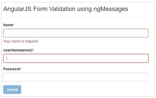 As you can see in the above code, we are using the ngMessages directive for handling validations. ngMessage directive will display the message according to the true value of its particular key present in the key collection of ngMessages. Also, we are using a remote template for defining message keys and referring to the same on the index page. This is done to show the reusability of messages. The submit button is disabled if the form is invalid. When all the validations get successful, the button gets enabled.