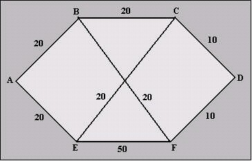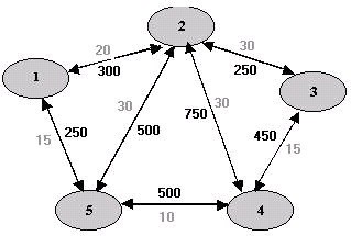 In this process, we find mean packet delay, if the capacity and average flow are known. From the mean delays on all the lines, we calculate a flow-weighted average to get mean packet delay for the whole subnet. The weights on the arcs in the below figure give capacities in each direction measured in kbps.